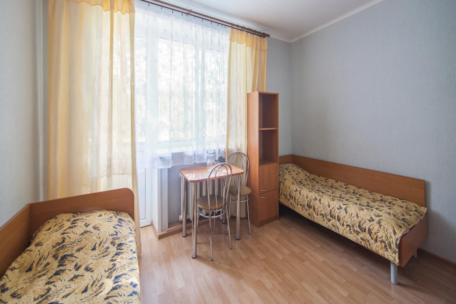 2 осн. места. 1 доп. место. Мебель: вешалка, кровати односпальные, прикроватные тумбочки, стол, стулья. Оборудование. Санузел и душевые на этаже. Сервис: смена полотенец, смена постельного белья, уборка номера.