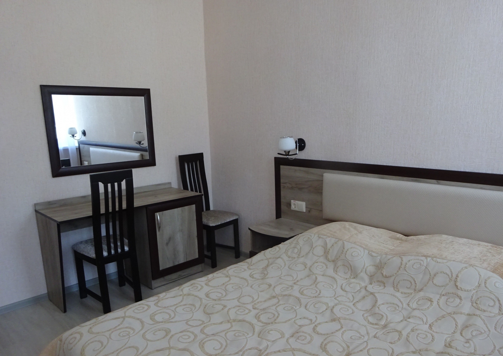 1 осн. место. 3 доп. места. Мебель: вешалка, диван, зеркало, кровать двуспальная, прикроватные тумбочки, стол, стулья, шкаф. Оборудование: гладильная доска, кондиционер, телевизор, утюг, холодильник. Санузел: с душем, тапочки, туалетные принадлежности, фен, халат. Сервис: Wi-Fi бесплатно, смена полотенец, смена постельного белья, уборка номера.