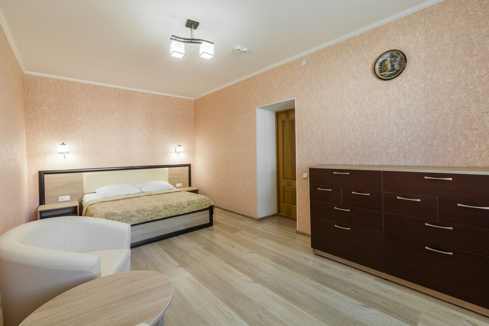 1 осн. место. 3 доп. места. Мебель: вешалка, диван, зеркало, кровать двуспальная, прикроватные тумбочки, стол, стулья, шкаф. Оборудование: гладильная доска, кондиционер, сейф, телевизор, утюг, холодильник, электрочайник. Санузел: с душем, тапочки, туалетные принадлежности, фен, халат. Сервис: Wi-Fi бесплатно, смена полотенец, смена постельного белья, уборка номера.