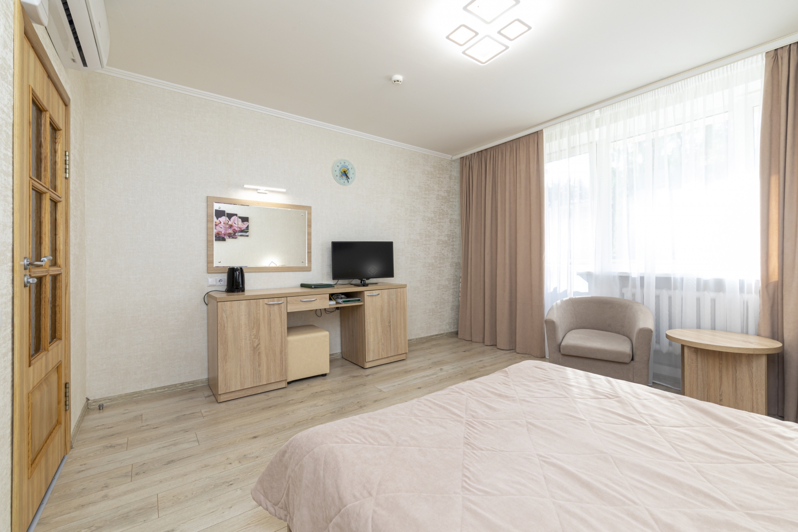 1 осн. место. 2 доп. места. Мебель: вешалка, диван, зеркало, кровать двуспальная, прикроватные тумбочки, стол, стулья, шкаф. Оборудование: гладильная доска, кондиционер, сейф, телевизор, утюг, холодильник, электрочайник. Санузел: с душем, тапочки, туалетные принадлежности, фен, халат. Сервис: Wi-Fi бесплатно, смена полотенец, смена постельного белья, уборка номера.